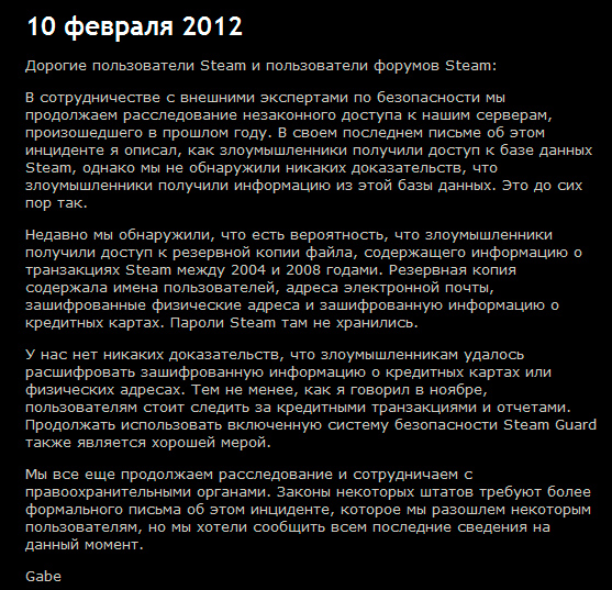 | 10 Февраля Дорогие пользователи Steam и пользователи форумов Steam: В сотрудничестве с внешними экспертами по безопасности мы продолжаем расследование незаконного доступа к нашим серверам, произошедшего в прошлом году. В своем последнем письме об этом инциденте я описал, как злоумышленники получили доступ к базе данных Steam, однако мы не обнаружили никаких доказательств, что злоумышленники получили информацию из этой базы данных. Это до сих пор так. Недавно мы обнаружили, что есть вероятность, что злоумышленники получили доступ к резервной копии файла, содержащего информацию о транзакциях Steam между 2004 и 2008 годами. Резервная копия содержала имена пользователей, адреса электронной почты, зашифрованные физические адреса и зашифрованную информацию о кредитных картах. Пароли Steam там не хранились. У нас нет никаких доказательств, что злоумышленникам удалось расшифровать зашифрованную информацию о кредитных картах или физических адресах. Тем не менее, как я говорил в ноябре, пользователям стоит следить за кредитными транзакциями и отчетами. Продолжать использовать включенную систему безопасности Steam Guard также является хорошей мерой. Мы все еще продолжаем расследование и сотрудничаем с правоохранительными органами. Законы некоторых штатов требуют более формального письма об этом инциденте, которое мы разошлем некоторым пользователям, но мы хотели сообщить всем последние сведения на данный момент. Gabe Прикреплённое изображение | |